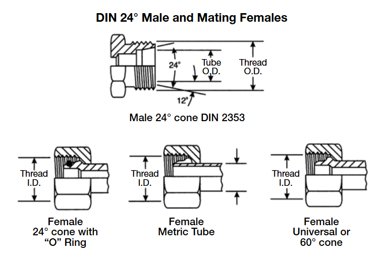 DIN 24°錐外螺紋接頭可與以下三種內(nèi)螺紋接頭相配了解情況。外螺紋接頭有24”錐面深入,直管公制螺紋和與鋼管外徑相匹配的臺(tái)階孔。與之相匹配的內(nèi)螺紋接頭可以是24°外錐帶O形圈,(DKO型式)的公制管接頭或者通用的24°錐或60°錐完善好。