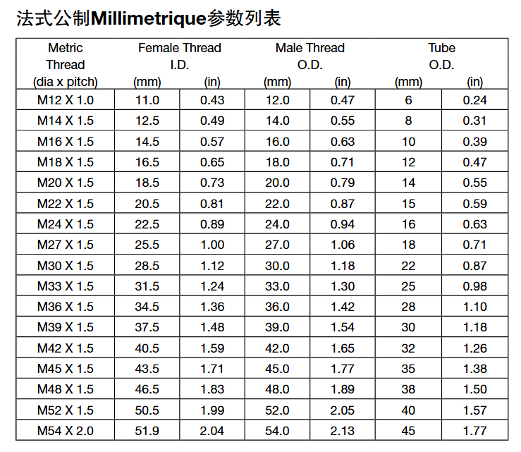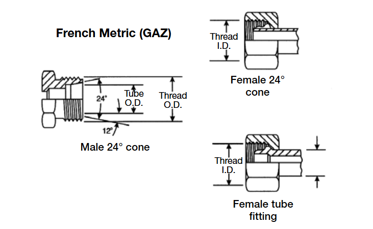 法式接頭包括普通的外螺紋接頭和2種不同的內(nèi)螺紋接頭單產提升,法式公制(GAZ)外螺紋接頭可以匹配24°錐內(nèi)螺紋接頭和管內(nèi)螺紋接頭。外螺紋接頭有24°內(nèi)錐面和直管公制螺紋試驗。內(nèi)螺紋接頭有24度外錐面或管套和直管公制螺紋勞動精神。Millimetrique系列可用于所有管徑的公制管,GAZ系列只可用少數(shù)管徑的公制管製度保障。