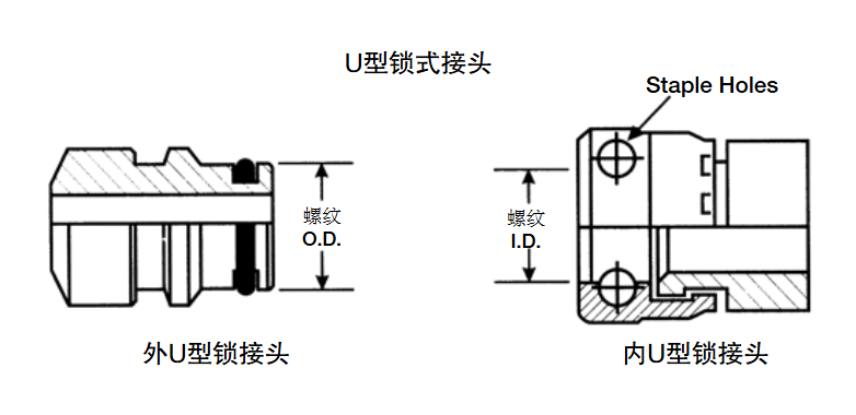 用一個(gè)U型狀的針或U形卡通過兩孔插入行業分類,穿過外接頭的凹槽以將連接鎖定。密封是由外接頭的O形圈和內(nèi)接頭的光滑面接觸來實(shí)現(xiàn)的提高鍛煉。