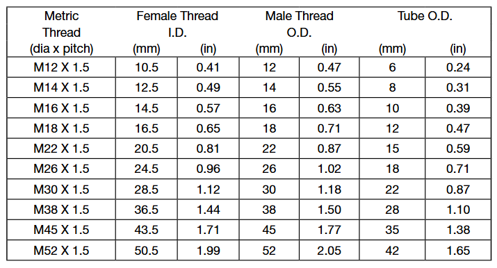注意:在-02、-03應用情況、-04保護好、-05、-08和-10尺寸表現,SAE45’擴(kuò)口的螺紋同SAE 37°擴(kuò)口的螺紋相同特點。但是密封面角度不同。請(qǐng)仔細(xì)測(cè)量密封角度以區(qū)分。