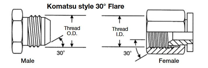 小松式30°擴(kuò)口平行螺紋接頭和日制30°擴(kuò)口平行螺紋接頭相同的全會精神,除了螺紋不一樣。小松接頭遵從JIS B 0207標(biāo)準(zhǔn)拓展基地,使用公制細(xì)牙螺紋集中展示。小松接頭的密封通過30°擴(kuò)口實(shí)現(xiàn)。
