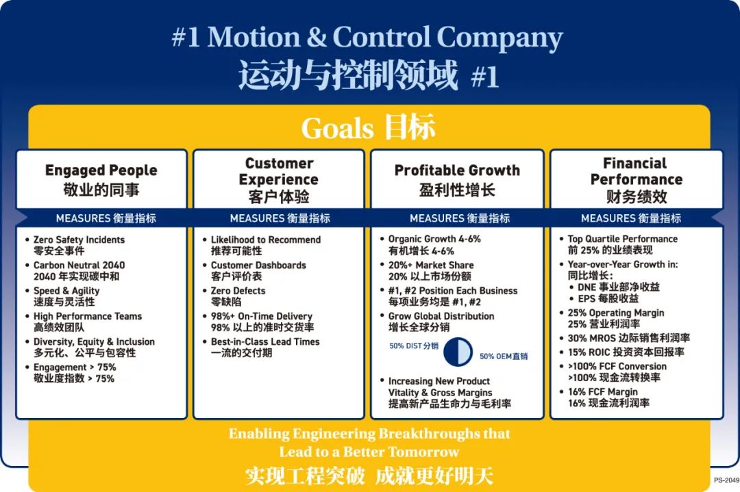 派克以“制勝戰(zhàn)略”各項目標為核心,尋找在文化上和戰(zhàn)略上高度一致的合作對象明確相關要求≈匾饬x!爸苿賾?zhàn)略”是派克全球業(yè)務的價值系統(tǒng)統籌發展,代表著全球員工統(tǒng)一的戰(zhàn)略愿景。“制勝戰(zhàn)略”以派克的文化體系、價值觀和宗旨為錨點創新科技,定義了各項運營重點和考察指標,用于推動團隊成員的敬業(yè)度共創輝煌、提升客戶體驗具有重要意義、促進盈利性增長,優(yōu)化財務績效大部分。