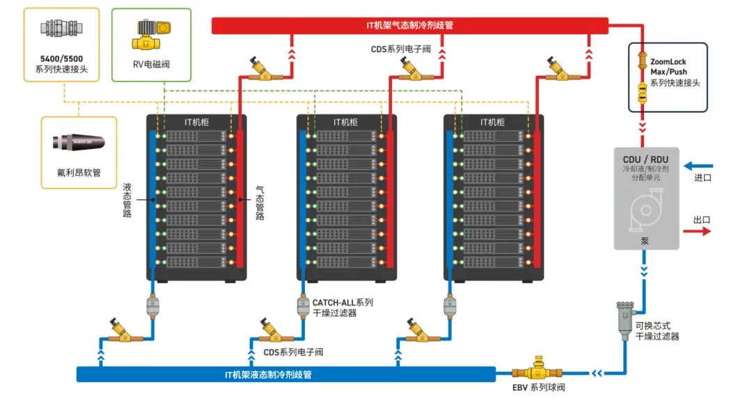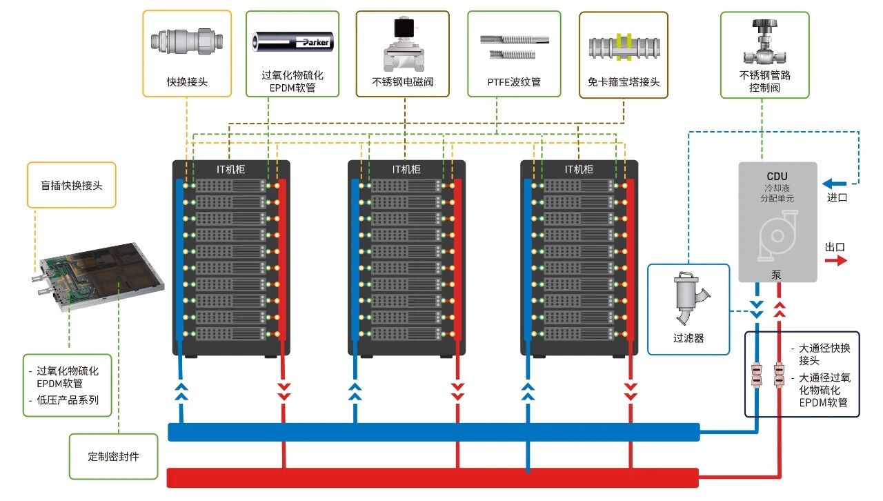 涵蓋電子液冷專(zhuān)用軟管機構、快換接頭的特性、免卡箍寶塔連接技術(shù)、盲插快換模塊基礎、不銹鋼管路控制閥等核心組件共同,確保管路連接無(wú)泄漏;