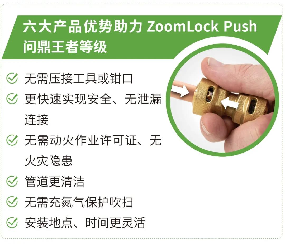 如果空調(diào)制冷管路連接技術(shù)也有段位的話,那么ZoomLock Push推入/按壓式接頭一定是王者等級(jí)讓人糾結!它不僅延續(xù)原ZoomLock產(chǎn)品的尊貴血統(tǒng),堅(jiān)守安全不要畏懼、清潔的無(wú)泄漏連接品質(zhì),更另辟蹊徑問題,進(jìn)一步加速管道安裝逐漸顯現。