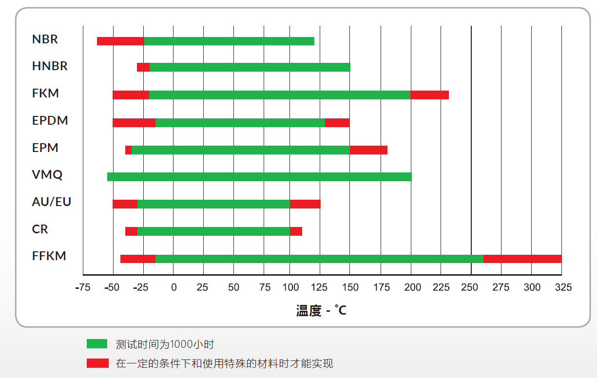 當(dāng)然了,不同的密封介質(zhì)解決方案,對(duì)O型圈的抗熱強(qiáng)度是不同的趨勢。比如100°?C?空氣溫度和100?°C油溫度對(duì)O型圈的抗熱強(qiáng)度要求是不同的。下表給出部分彈性材料的工作溫度范圍上高質量,以空氣為例一站式服務。