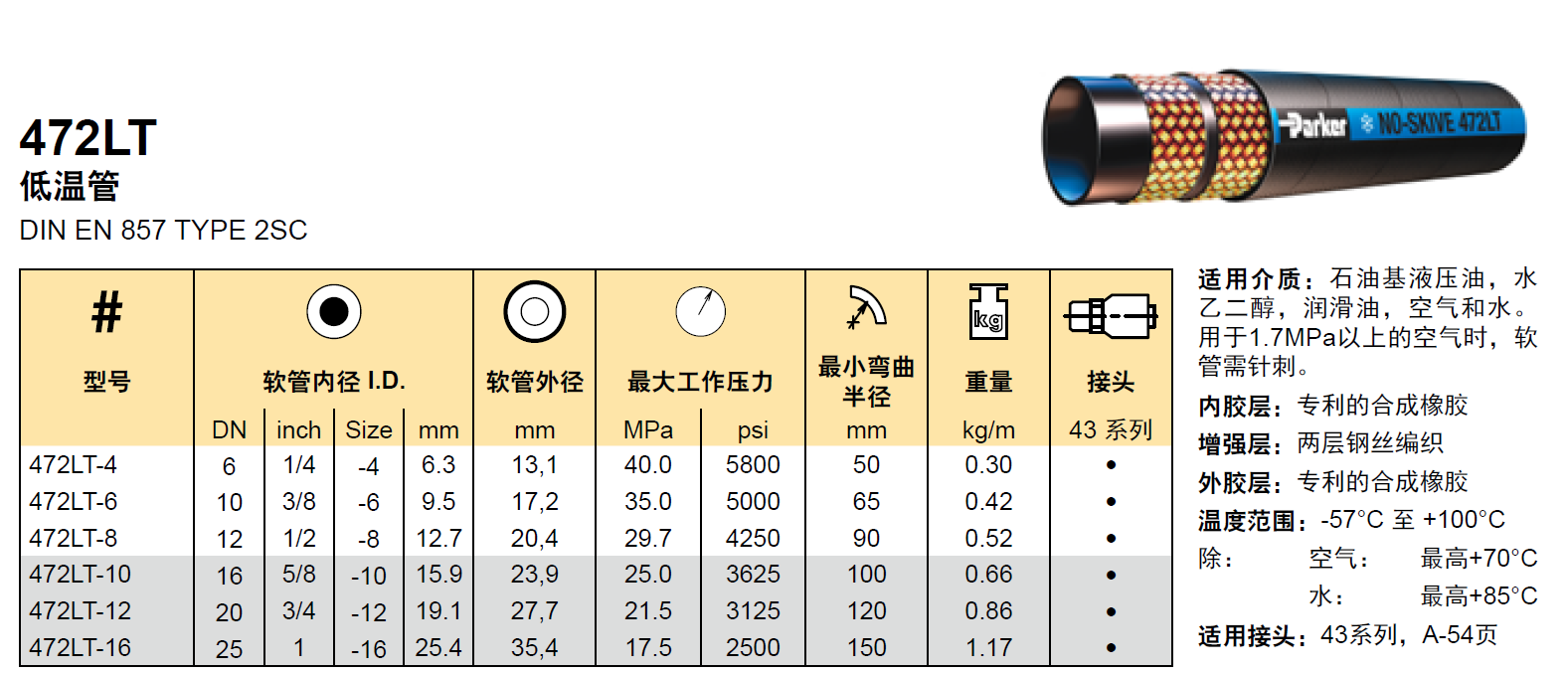 常規(guī)液壓軟管的額定工作溫度最低為–40°C開放要求,而Parker的低溫液壓軟管向好態勢,可以達(dá)到-57°C。